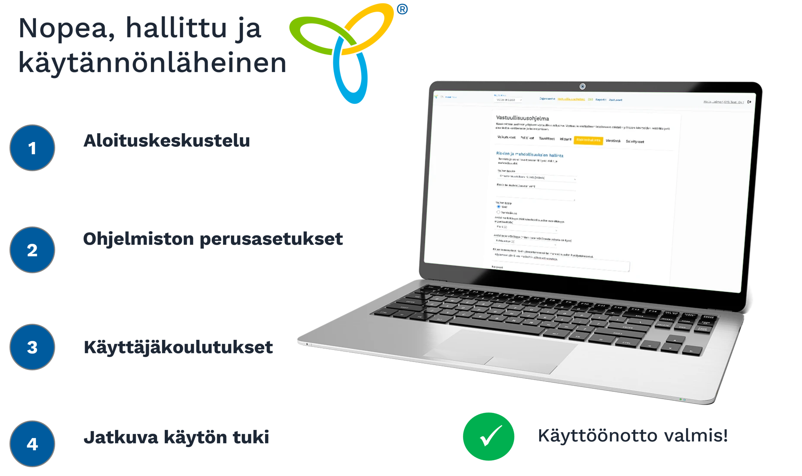 SYS on suunniteltu käyttäjäystävälliseksi ja helposti käyttöönotettavaksi. Ohjelmisto ohjaa tekemistä selkeästi vaihe vaiheelta, eikä edellytä aiempaa kokemusta johtamisjärjestelmistä tai vastuullisuusraportoinnista.