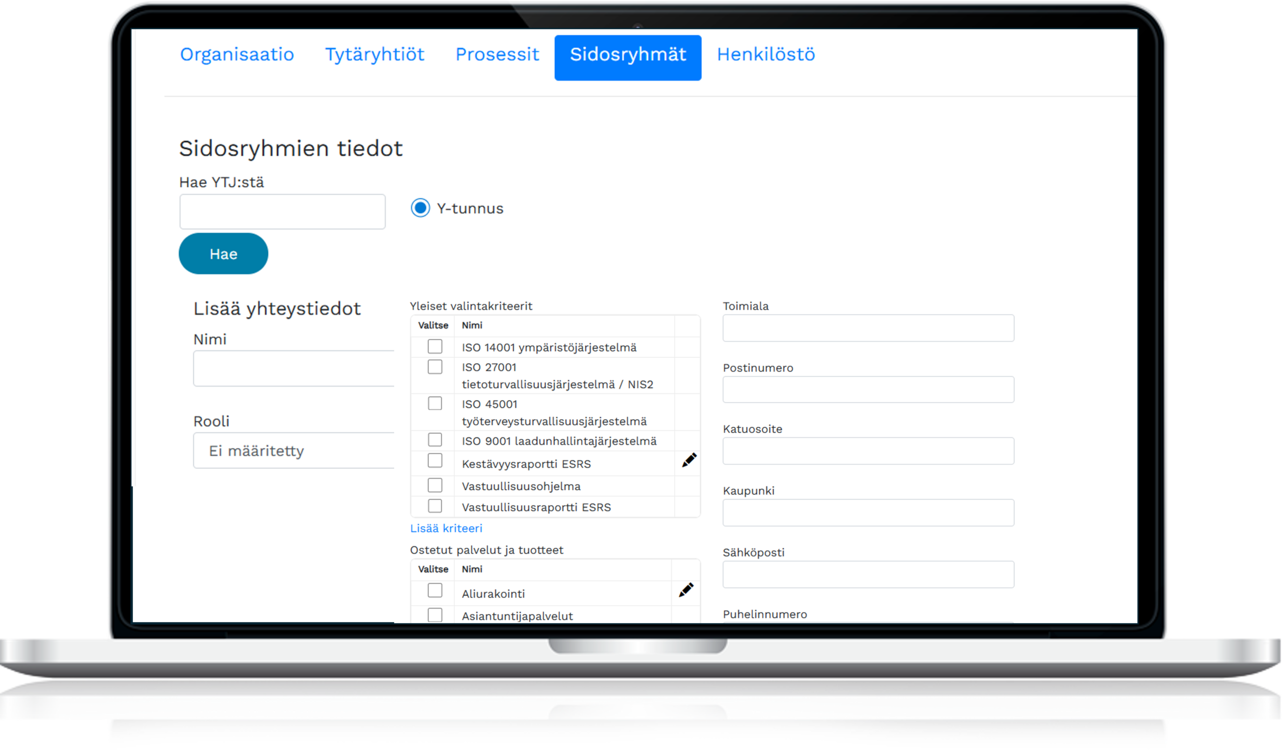 Ohjelmiston avulla voidaan selvittää toimittajien ja alihankkijoiden vastuullisuuden nykytilaa, ylläpitää toimittajarekisteriä sekä määrittää toimittajakohtaiset kriteerit.