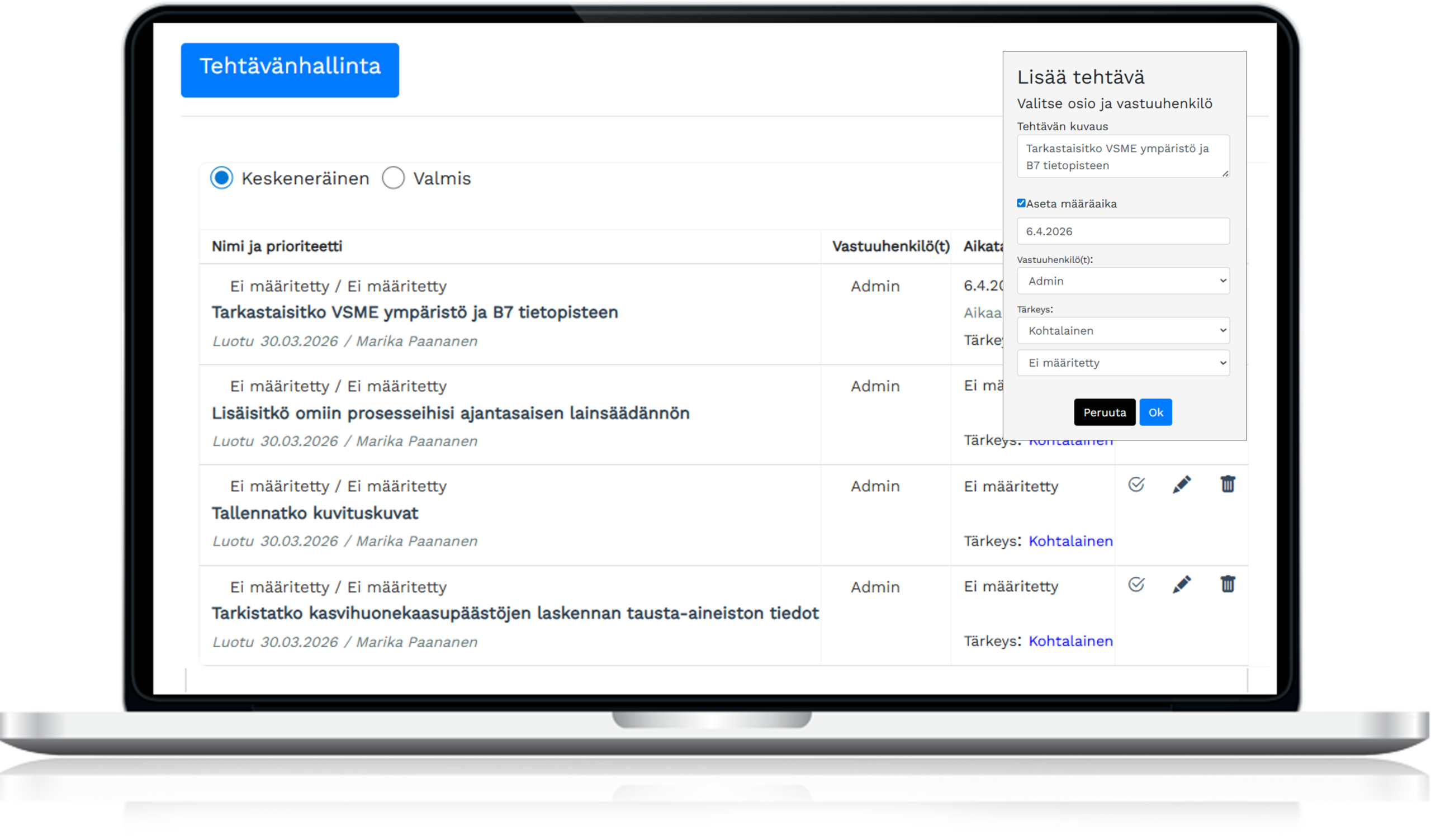 Samalla ohjelmisto kokoaa auditoinneissa tarvittavat tiedot ja dokumentaation yhteen. Toiminnot ovat yhdessä näkymässä, jolloin kokonaisuus pysyy