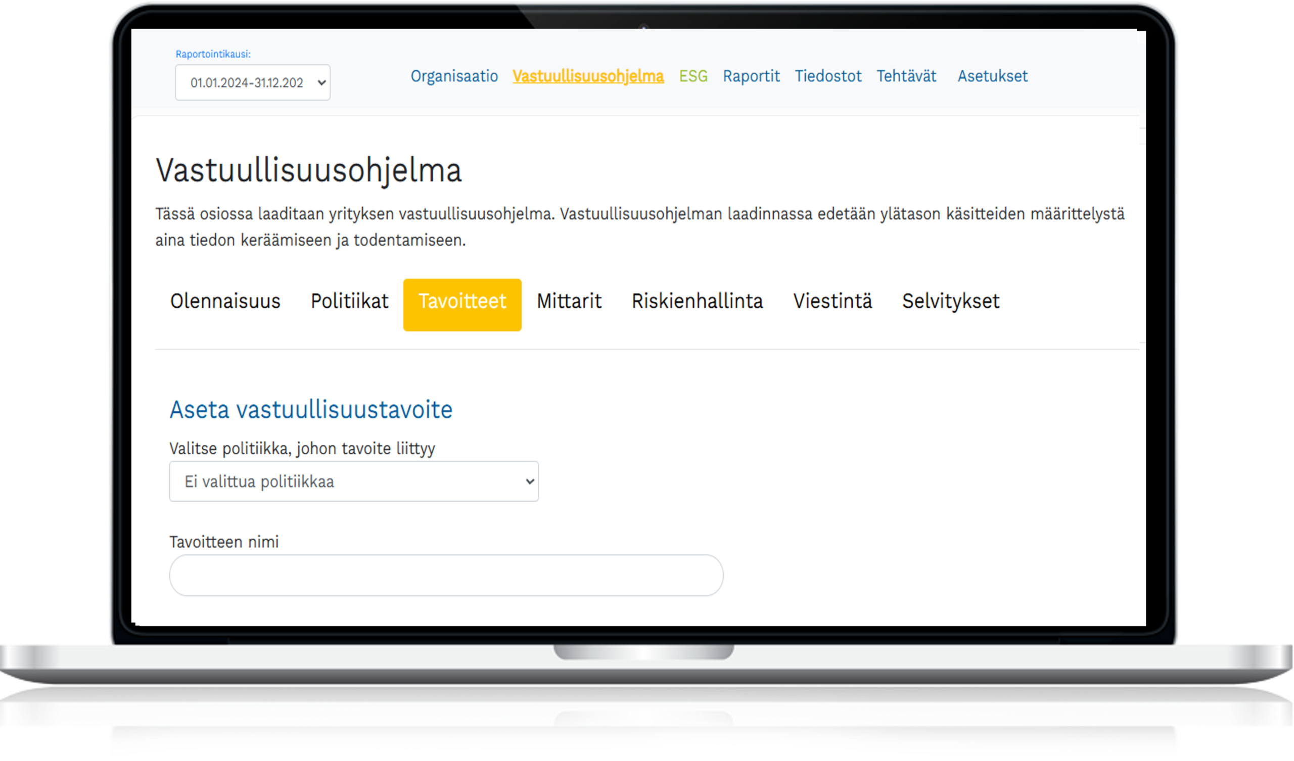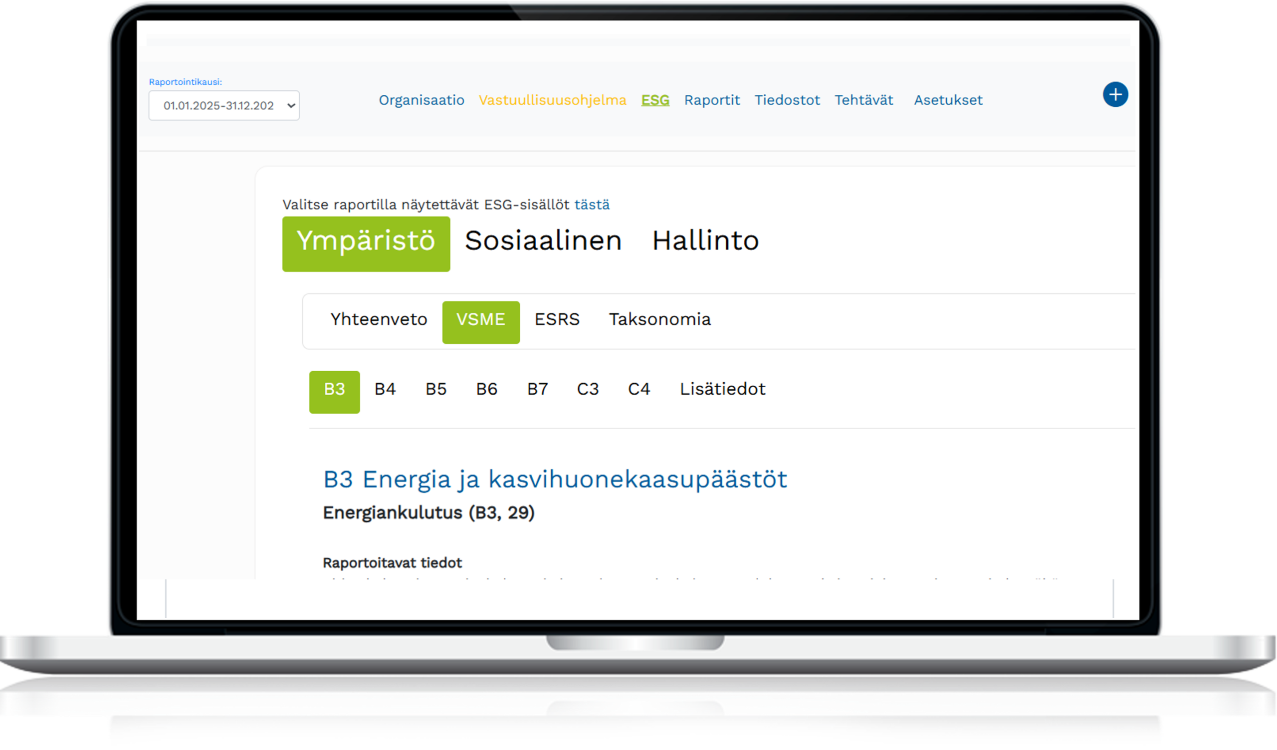 Ohjelmistossa on VSME-standardin mukainen raportointipolku perus- ja laajennetulle moduulille. Jokainen tietopisteet on kirjoitettu ohjelmistoon selkokielellä ja tuettu konkreettisilla esimerkeillä. Kun tiedot kirjataan ohjelmistoon, se muodostaa vastuullisuusraportin automaattisesti valittujen tietojen perusteella valmiin vastuullisuusraportin.